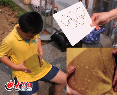 一位市民用自制的五環(huán)形狀的小孔,在一位小朋友身上形成一個(gè)個(gè)“日牙”