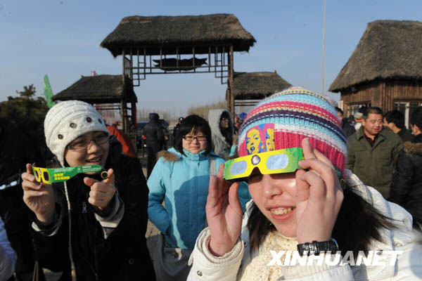 1月15日,兩名女孩在青島西大洋休閑漁村用專用日食觀測(cè)眼鏡觀看太陽(yáng)。新華社記者 李紫恒 攝