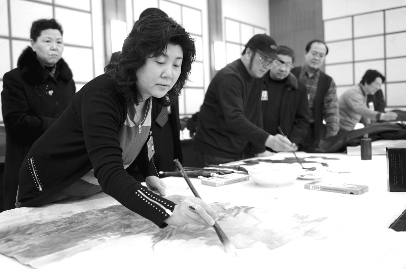 ▲1月 25 日下午,省政協十屆三次會議在省軍區招待所舉行書畫筆會, 10位政協委員書畫家揮毫潑墨,一幅幅精美的書畫作品表達對兩會召開的喜悅心情和對我省經濟社會發展前景的美好祝愿。