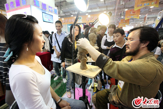 淄博館內泥塑藝術家現場雕刻泥塑像