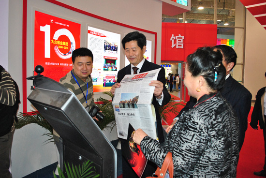 27日,文博會開幕前,大眾報業集團黨委書記、董事長、總編輯傅紹萬手持一期大眾日報留下合影。(馮經偉 攝)