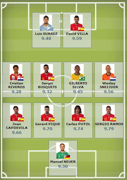 本期國際足聯數據榜最佳陣容為:門將:諾伊爾(德國,9.30分);后衛拉莫斯(西班牙,9.79分)、普約爾(西班牙,9.74分)、皮克(西班牙,9.70分)、卡普德維拉(西班牙,9.66分);中場斯內德(荷蘭,9.56分)、吉爾伯托-席爾瓦(巴西,9.45分)、布斯克茨(西班牙,9.32分)、里維羅斯(巴拉圭,9.28分);前鋒比利亞(西班牙,9.59分)、蘇亞雷斯(烏拉圭,9.48分)。