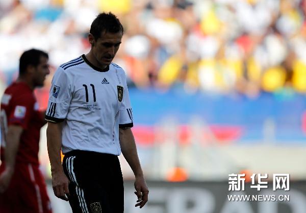 6月18日,德國隊球員克洛澤(右)在比賽中。克洛澤因累計兩張黃牌被罰出場。當日,在伊麗莎白港進行的2010南非世界杯D組比賽中,德國隊對陣塞爾維亞隊。 新華社記者廖宇杰攝