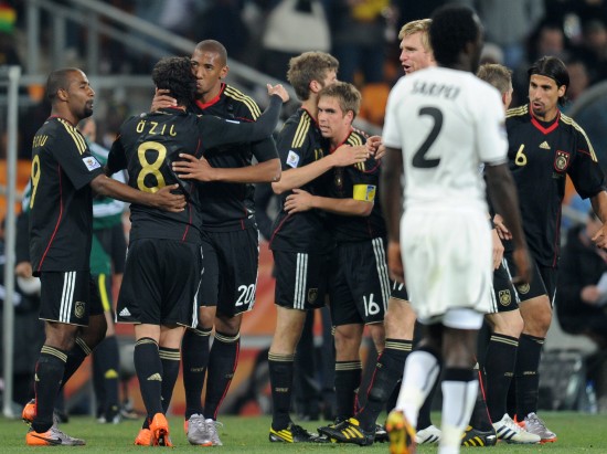 德國(含西德)在世界杯上從未小組出局,與非洲球隊交鋒5次僅負1場,即1982年1比2不敵阿爾及利亞,上輪德國0比1負于塞爾維亞,結束了小組賽16場不敗,該隊上次世界杯連敗要追溯到1978年末戰和1982年首戰。熱爾姆-博阿滕頂替巴德斯圖伯,上演世界杯處子秀,他與對方同父異母的普林斯-博阿滕成為世界杯歷史上首對兵戎相見的親兄弟。卡考頂替停賽的克洛澤。
