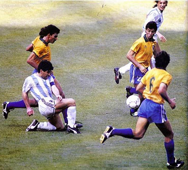 第81分鐘,61381名觀眾在都靈阿爾卑球場共同見證了這個神奇瞬間的到來。馬拉多納在中場帶球,先在中圈變線晃過了阿萊芒,隨后帶球躲過了鄧加的鏟搶,又利用假動作突破了迎上來的羅查,在多名巴西球員形成包夾之勢時,馬拉多納倒地將球傳給了左路無人防守的卡尼吉亞,后者繞過門將塔法雷爾輕松破門。