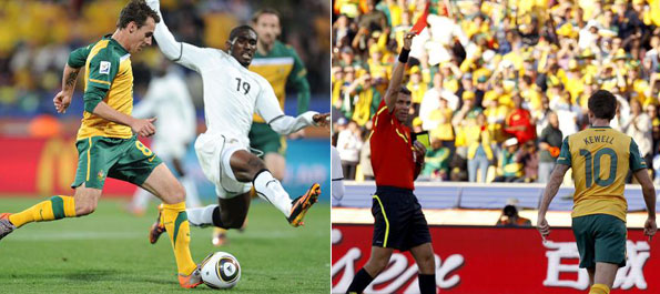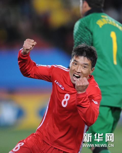 6月15日,朝鮮隊球員池潤南慶祝進球。當日,在2010南非世界杯小組賽G組比賽中,朝鮮隊以1比2負于巴西隊。 新華社記者李尕攝