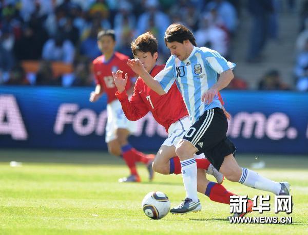 6月17日,阿根廷隊(duì)球員梅西(右)在比賽中帶球突破。當(dāng)日,在約翰內(nèi)斯堡舉行的2010年南非世界杯小組賽B組比賽中,阿根廷隊(duì)迎戰(zhàn)韓國隊(duì)。新華社記者郭勇攝