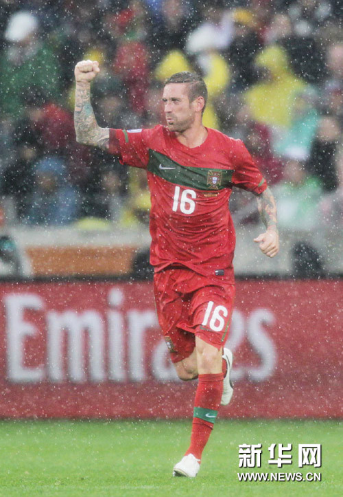 6月21日,葡萄牙隊球員勞爾·梅雷萊斯慶祝進球。當日,在開普敦舉行的2010南非世界杯G組比賽中,葡萄牙隊對陣朝鮮隊。新華社記者邢廣利攝