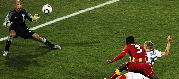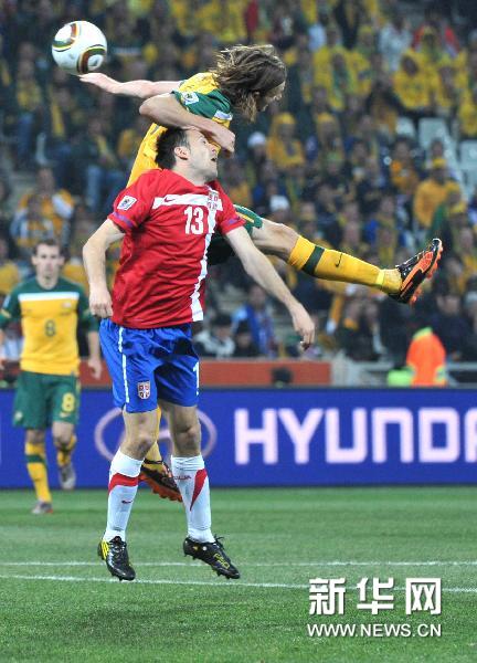 6月23日,澳大利亞隊球員肯尼迪(上)與塞爾維亞隊球員亞歷山大·盧科維奇爭頂。當日,在南非內爾斯普雷特舉行的2010南非世界杯足球賽D組最后一輪比賽中,澳大利亞隊以2比1戰勝塞爾維亞隊,但兩隊雙雙在D組中被淘汰。新華社記者徐速繪攝