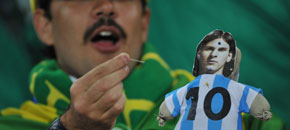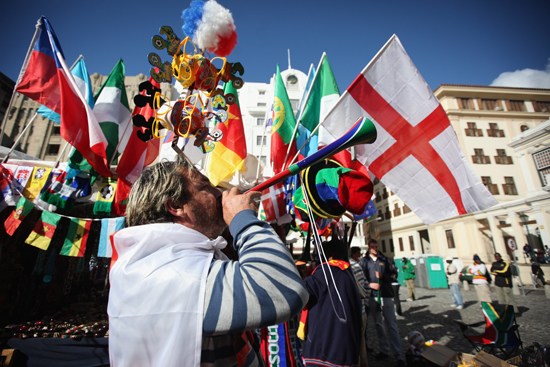 北京時間6月9日,2010年南非世界杯開幕在即,約翰內斯堡成歡樂海洋,球迷足球城前載歌載舞。圖為球迷準備助威“武器”。
