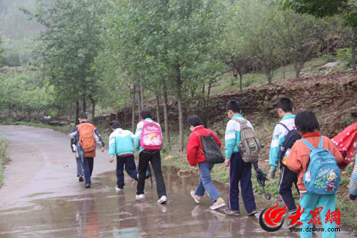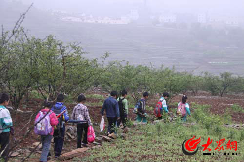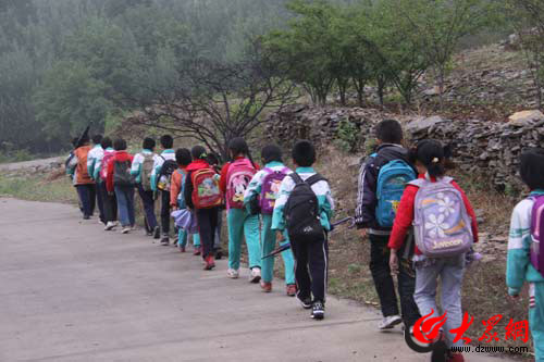 5月17日下午5點左右,臨沂市沂水縣西部的群山里云環(huán)霧繞、細雨蒙蒙。在夏蔚鎮(zhèn)透明崮村旁的環(huán)山公路上,一群高矮不一的孩子正冒雨排隊往前走。他們都是夏蔚鎮(zhèn)透明崮教學(xué)點剛剛放學(xué)的學(xué)生,他們的家就散落在周圍大山深處的十幾個自然村里,最遠的學(xué)生要翻越一座大山,走將近兩個小時才能到家。