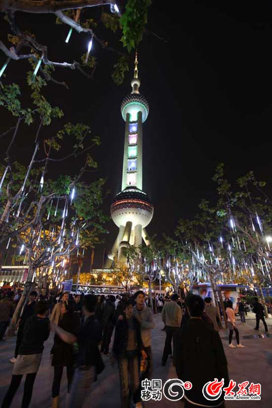 大眾網(wǎng)-移動G3上海4月30日快訊(特派記者 馮煒程 吳哲)今天是上海的節(jié)日,是中國的節(jié)日,全世界的目光都聚集到上海。晚上8點多鐘,眾多的上海市民和游客聚攏到上海標(biāo)志性建筑東方明珠塔周圍,爭睹上海夜的璀璨,共慶世博盛會華彩開幕。