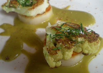 前菜我們向您推薦法式鵝肝醬,配酸櫻桃和開心果,這道鵝肝醬的特色就在于鵝肝分了三層,頂層是略帶酸甜的櫻桃醬與開心果,第二層是綿軟細致的鵝肝,而第三層墊底的則是一塊烤的香酥的面包,整個三層結構搭配非常合理,底層的面包吸收鵝肝醬本身的油膩,使得鵝肝入口肥而不膩,而頂層的醬汁滴落到鵝肝上,使得原味鮮而無味的鵝肝,有了一絲絲清甜的香味,有生之年能吃一例這樣的極品鵝肝,絕對是一種莫大的享受。