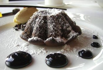 最后一道甜點我們要推薦的就是巧克力熔巖蛋糕。這份蛋糕光看外形,就讓人覺得非常有藝術家氣息,做的像火山一樣的巧克力蛋糕,周邊點綴著大湖一樣清亮的巧克力醬和雪團一樣的冰激凌,不用味蕾去感受,光是視覺就能讓您有莫大的享受,而從口味上來說,這道蛋糕本身并不甜,主要是濃厚的巧克力味,而調味主要靠的最后上桌前撒上的一層糖粉,微甜帶一絲苦,