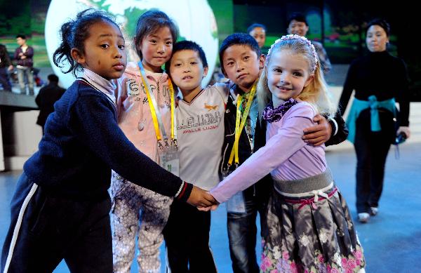 參加上海世博會開幕式演出的小伙伴藝術團小演員李小鳳(右一)等與來自玉樹地震災區的代吉文毛(左二)和江巴才仁(右二)在參加彩排(4月26日攝)。