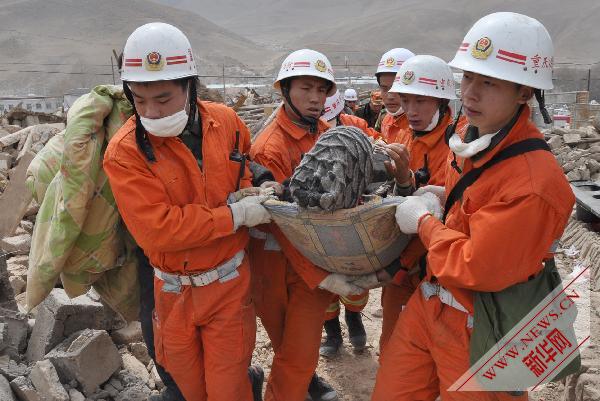 當(dāng)日上午10時25分,在地震廢墟下被困近51個小時的澤仁多吉,被來自重慶的消防救援隊成功救出,目前他已經(jīng)被送往西寧進(jìn)行醫(yī)治,沒有生命危險。“4·14”玉樹地震發(fā)生后,重慶消防總隊200多名官兵輾轉(zhuǎn)千里到達(dá)玉樹災(zāi)區(qū),他們攜帶生命探測儀、搜救犬等全力救援受災(zāi)群眾。新華社發(fā)(陳顯斌攝)
