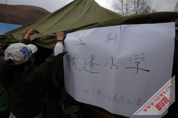 當日,來自四川省綿陽市的“完美春天”志愿者隊伍在玉樹縣第二完全小學建立起的一所帳篷學校開課。 新華社記者丁海濤攝