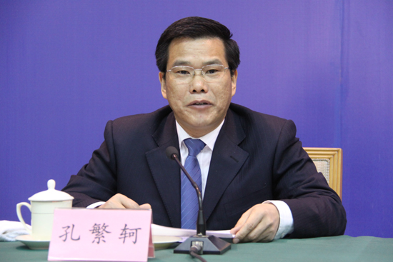 山東省人民政府新聞辦公室副主任、山東省新聞發(fā)布工作協調小組辦公室主任孔繁軻主持發(fā)布會