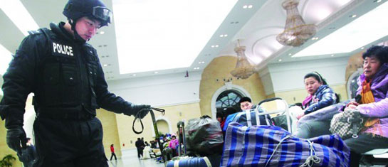 1月28日,在山東濟南火車站,旅客在排隊檢票上車。新華社記者 徐速繪 攝