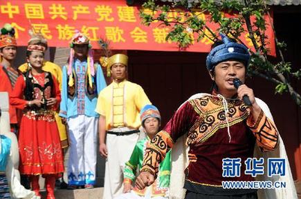 4月22日,中華民族園少數民族原生態藝術團演員在首期紅歌會上唱紅歌。為迎接中國共產黨建黨九十周年,北京市愛國主義教育基地、民族團結教育基地——中華民族園,于2011年4月至7月開展“‘唱支山歌給黨聽’56個民族唱紅歌”主題活動。在中華民族園工作的各民族同胞唱響紅歌。新華社記者張旭攝