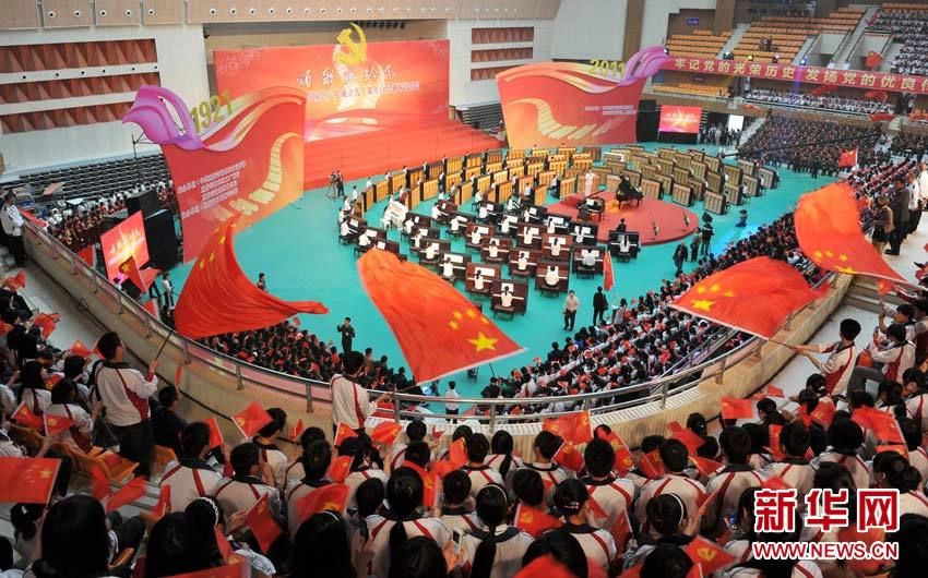 4月19日,重慶市渝北區體育館內,上千名來自社區的群眾齊唱《沒有共產黨就沒有新中國》、《走進新時代》等紅色歌曲,百名鋼琴演奏者共同演奏《東方紅》、《歌唱祖國》,向中國共產黨成立90周年獻禮。