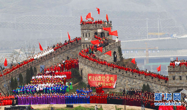 資料圖片:3月4日,為迎接建黨90周年,重慶洋人街風景區“長城”景點舉行千人紅歌會。3000余名市民登上“長城”,共同唱響《歌唱祖國》《紅梅贊》《四渡赤水》等近40首紅歌。重慶晚報/IC