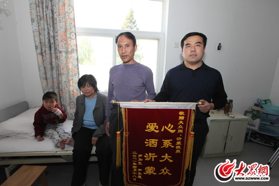 上午11時許,大眾網副總編輯姜長勇在小永康的病床前,代表大眾網、沂蒙晚報和廣大網友鄭重地將30077元現金交到小永康養父尹加元手里,祝福小永康手術順利、早日康復。接過三個厚厚的信封,尹加元夫妻倆感動地不知說什么好,妻子季成美激動地撲通一聲跪了下來。為了表達全家的謝意,尹加元一家為大眾網和沂蒙晚報分別制作了一面錦旗。他把寫有“心系大眾,愛灑沂蒙”的錦旗送到了大眾網副總編姜長勇手中,把感謝沂蒙晚報的錦旗送到了大眾網總編助理、采訪中心主任李冉手中,由她代為轉交沂蒙晚報。