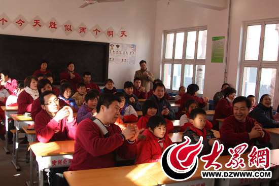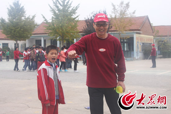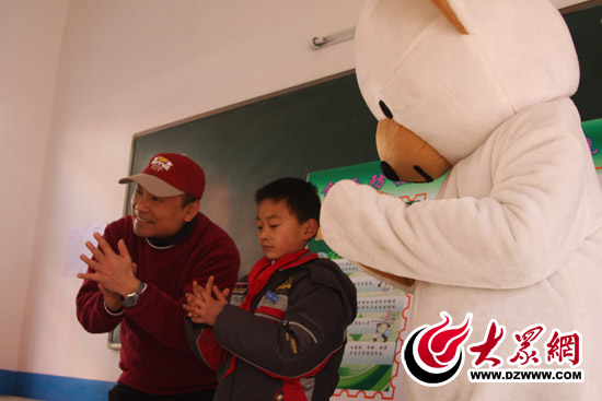 志愿者馬站英(左)、侯召亮(右)在濟(jì)南劉家慈安小學(xué)和小朋友們互動