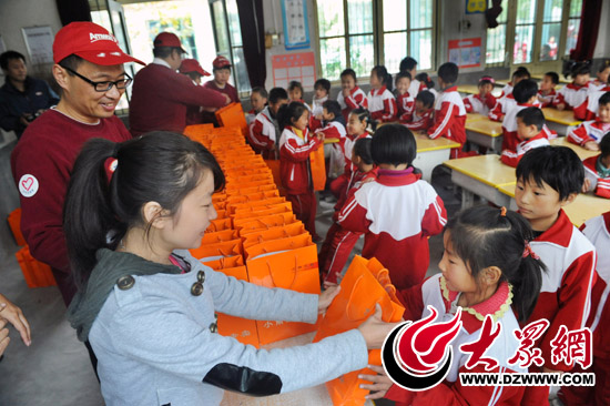 志愿者張軍(右)將公司捐獻(xiàn)的新課桌送到濟(jì)南劉家慈安小學(xué)