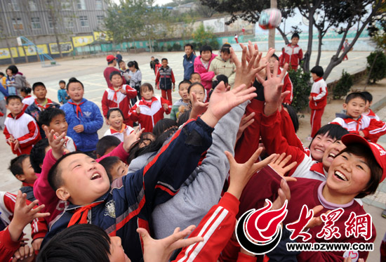 志愿者王敏深受穆家小學(xué)孩子們的喜歡,在比賽間隙王敏和同學(xué)們玩搶沙包游戲