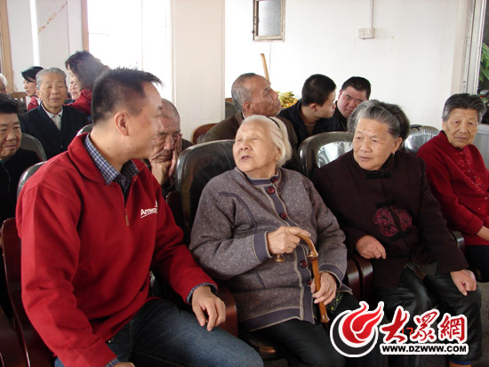 濟寧福利院情暖夕陽安利志愿者喬磊與福利院老人親切交談