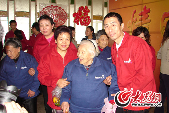 濟寧福利院情暖夕陽安利志愿者尚均、馮秀云攙扶老人進入聯歡會場
