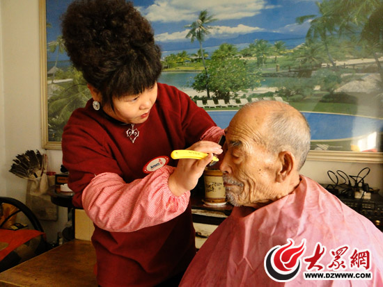淄博安利志愿者劉曉青為老人理發刮臉
