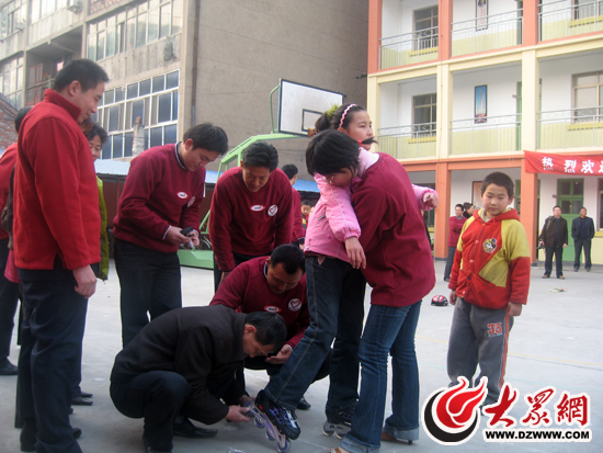 濟寧安利志愿者杜新軍給特教學生安裝輪滑鞋