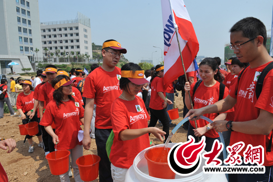 - 濟(jì)南植樹活動中,志愿者王冬幫有序排隊的志愿者們接水