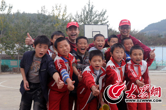 在濟南仲宮穆家小學校園里,志愿者曹衍合、陶俊嶺和獲勝的同學們在一起