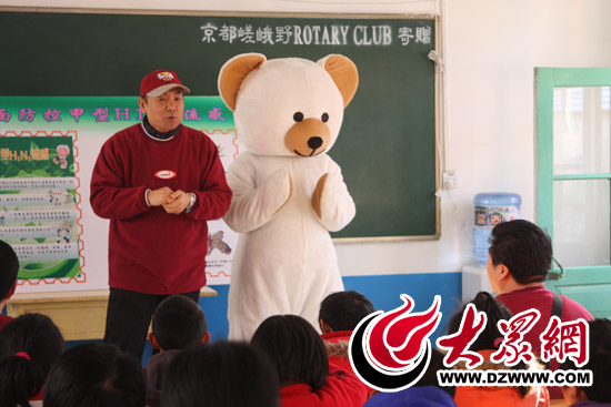 - 志愿者馬站英(左)、侯召亮(右)在濟南劉家慈安小學和小朋友們互動