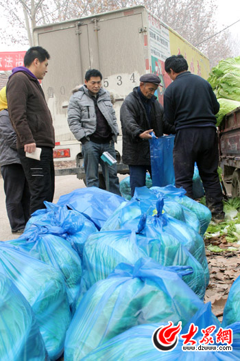 早上8點,張貼著“根植大眾 服務大眾”的10輛汽車從山東報業(yè)大廈出發(fā),向著歷城區(qū)唐王鎮(zhèn)南殷村駛去。據了解,11月17日,大眾報業(yè)(集團)發(fā)行有限公司響應大眾網發(fā)起的“今冬請吃愛心菜”活動,在唐王鎮(zhèn)南殷村訂下50000萬斤愛心菜。今天,發(fā)行公司副總經理冀魯向菜農兌現承諾,率領公司車隊來到南殷村,將首批37000斤愛心菜從地頭拉走。上午9點,南殷村村西面的菜地里一片繁忙景象。7戶菜農正忙著砍菜、掰幫、裝袋、過磅,一袋袋干干凈凈的大白菜被整齊地裝上汽車。