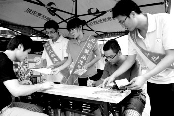 7月13日,濟南市洪樓廣場,義務獻血采血車前,肩披綬帶的志愿者正在幫助準備義務獻血的市民填寫信息表格。這些志愿者是山東建筑大學的大三學生,他們利用暑假時間,不顧天氣炎熱到義務獻血點進行志愿服務。(盧鵬 劉康)(完)
