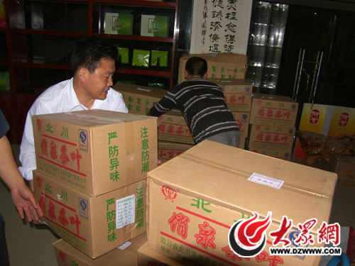 2日晚上8點30分,俏泉公司郭玉霞經理和另兩位工作人員駕駛著小貨車出現在高速路濟南北出口,他們與前來迎候的大眾網副總編輯、曾親赴北川考察茶葉困境的特派記者姜長勇匯合,郭玉霞還遇到了5.12地震期間曾赴北川做志愿者,并與她成為朋友的德州人張其國。隨后他們趕往濟南七里堡茶城的御青茶專賣店,將隨車帶來的數十箱北川茶卸下。
