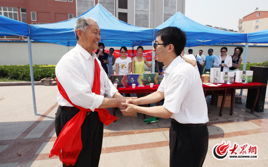 四川省自然天堂茶業有限公司總經理何勇強(右)給濟南西郊的76歲老人黃伯安獻上羌紅