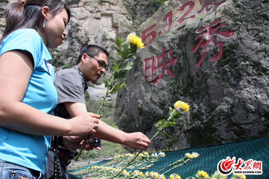 來自成都的數百名市民紛紛手持鮮花,輕輕地放在 “5.12震中-映秀”紀念磐石下,深切緬懷在地震中死難的人們。(曹亮 攝)