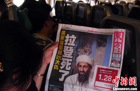 5月3日,世界各國傳媒紛紛報道本·拉登被美軍擊斃的新聞。圖為在馬尼拉飛往香港的航班上乘客閱讀有關本·拉登被美軍擊斃的新聞。中新社發 錢興強 攝