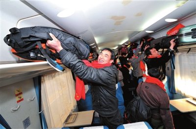 昨天,農民工楊衛(wèi)國(左一)登上北京西至十堰的K279次列車,準備返鄉(xiāng)過春節(jié)。當天,“2011年春節(jié)在京農民工平安返鄉(xiāng)歡送儀式”在京啟動,地鐵10號線二期慈壽寺站項目部工地的近200名農民工領到了由工會統(tǒng)一購買的車票,并由專車送到火車站返鄉(xiāng),今年預計有35萬以上農民工由工會幫忙購票。