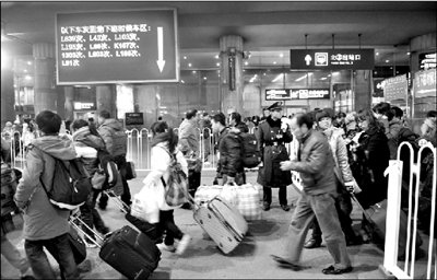 昨天上午,北京西站售票廳內,每個售票窗口都有四五十人排隊,火車票余票數(shù)額顯示屏大面積飄綠,除夕前發(fā)往武昌、西安、拉薩等地的車票幾乎售罄。