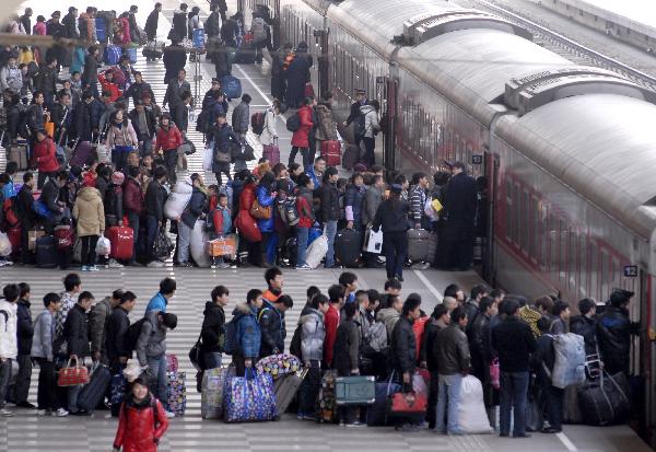 1月15日,旅客在南京火車站有序上車。當(dāng)日,鐵道部召開全國鐵路春運(yùn)新聞發(fā)布會,向公眾介紹今年鐵路春運(yùn)的總體態(tài)勢和鐵路部門的準(zhǔn)備情況。今年鐵路春運(yùn)自1月19日起至2月27日,為期40天,預(yù)計全國鐵路發(fā)送旅客2.3億人次,同比增長12.5%。新華社發(fā)