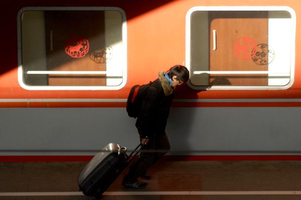 1月15日,南京火車站一名旅客拉著行李準(zhǔn)備上車。當(dāng)日,鐵道部召開全國鐵路春運(yùn)新聞發(fā)布會,向公眾介紹今年鐵路春運(yùn)的總體態(tài)勢和鐵路部門的準(zhǔn)備情況。今年鐵路春運(yùn)自1月19日起至2月27日,為期40天,預(yù)計全國鐵路發(fā)送旅客2.3億人次,同比增長12.5%。新華社發(fā)
