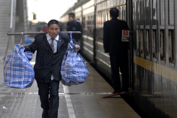 1月15日,南京火車站一名旅客挑著行李趕乘列車。當(dāng)日,鐵道部召開全國鐵路春運(yùn)新聞發(fā)布會,向公眾介紹今年鐵路春運(yùn)的總體態(tài)勢和鐵路部門的準(zhǔn)備情況。今年鐵路春運(yùn)自1月19日起至2月27日,為期40天,預(yù)計全國鐵路發(fā)送旅客2.3億人次,同比增長12.5%。新華社發(fā)