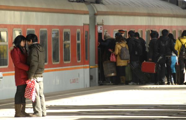 1月15日,在南京火車站站臺,一對學(xué)生情侶依依惜別。當(dāng)日,鐵道部召開全國鐵路春運(yùn)新聞發(fā)布會,向公眾介紹今年鐵路春運(yùn)的總體態(tài)勢和鐵路部門的準(zhǔn)備情況。今年鐵路春運(yùn)自1月19日起至2月27日,為期40天,預(yù)計全國鐵路發(fā)送旅客2.3億人次,同比增長12.5%。新華社發(fā)