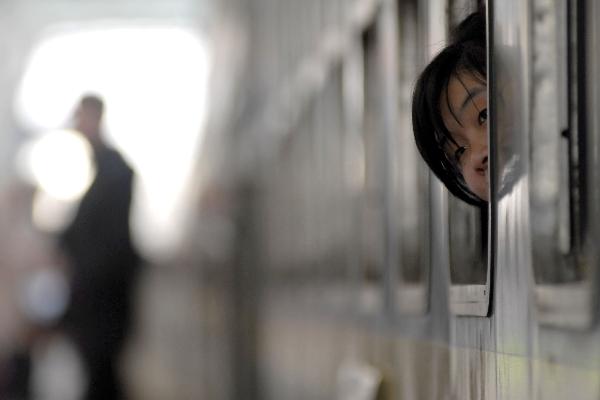 1月15日,在南京火車站一輛列車上,一名旅客向車窗外張望。當(dāng)日,鐵道部召開全國鐵路春運(yùn)新聞發(fā)布會,向公眾介紹今年鐵路春運(yùn)的總體態(tài)勢和鐵路部門的準(zhǔn)備情況。今年鐵路春運(yùn)自1月19日起至2月27日,為期40天,預(yù)計全國鐵路發(fā)送旅客2.3億人次,同比增長12.5%。新華社發(fā)